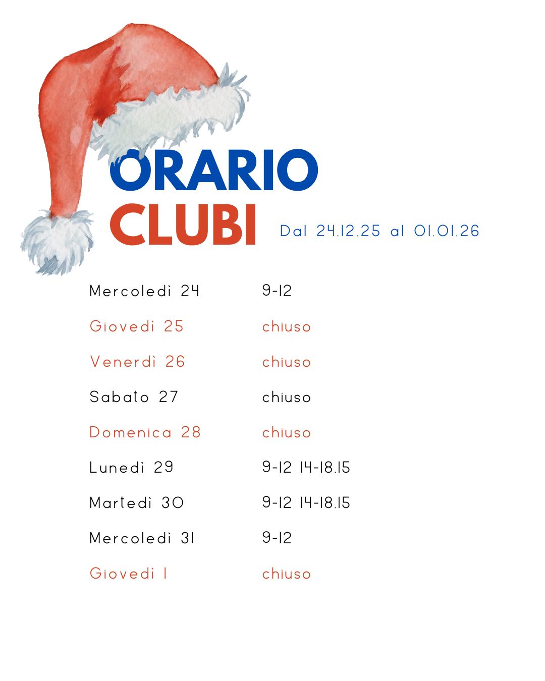 25, 26 e 27 dicembre: chiuso