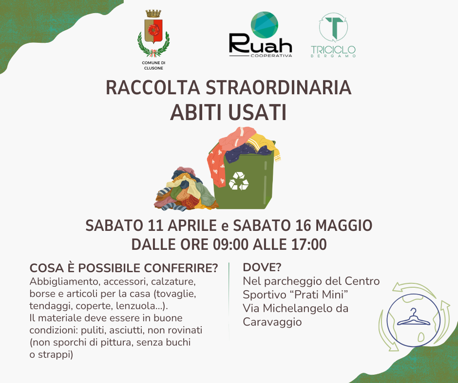 Cosa è possibile conferire? Abbigliamento, accessori, calzature, borse e articoli per la casa (tovaglie, tendaggi, coperte, lenzuola…).